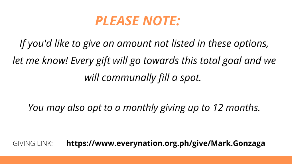 You may also give via BPI, BDO and GCASH for those from the Philippines at account name : Mark Gonzaga